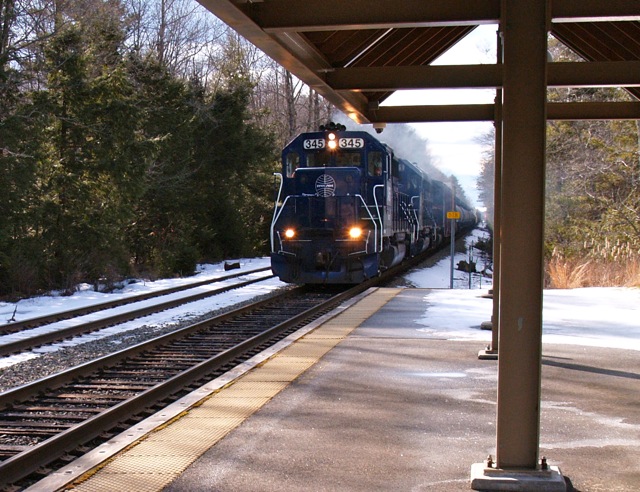 check out a location I knew about. Before we could make the turn we heard a whistle. It could only be a freight. So I raced down to the Main St. crossing by Hussey Manufacturing and we saw the freight that turned out to be EDPO (E. Deerfield, MA to Portland, ME). I didn't get a shot but DT&I Fan appeared to. We quickly loaded back into the car and reversed course for the Wells Transportation Center. We got there in the nick of time. I didn't set up very well and the lighting was awful, but I salvaged enough of this one shot. The train didn't slow much and did not stop so we figured he was trying to make Rigby before Amtrak needed the mainline. As you can see he was on the mainline with no intention of stopping.